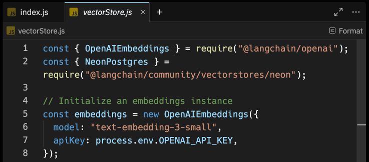 Through the @langchain/openai package, you are able to obtain vector embeddings for text via OpenAI API. The OpenAIEmbeddings class, when integrated with any LangChain Vector Store, simplifies the process of generating and inserting vector embeddings. Create a file named vectorStore.js, and with the following code in it, initialize the OpenAIEmbeddings class to easily generate vector embeddings under the hood.