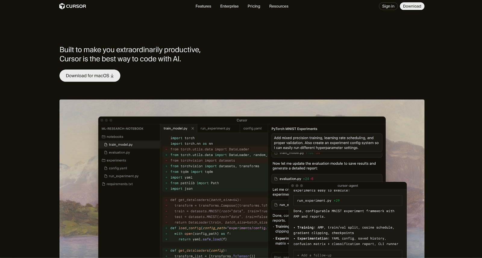 Cursor represents a comprehensive IDE alternative built specifically for AI-assisted development. Unlike Aider's terminal approach, Cursor delivers a complete VSCode-based editor with integrated AI capabilities throughout the interface.