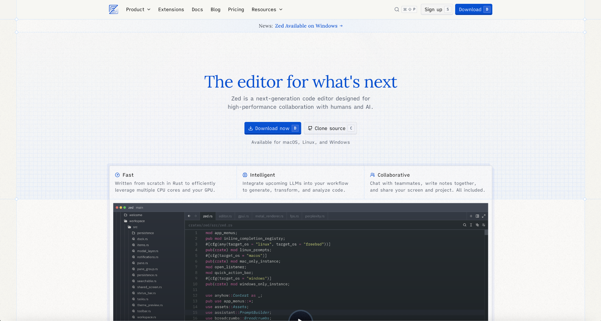 Zed represents a fresh take on code editors built from scratch in Rust with AI as core architectural principle. The editor's multiplayer capabilities enable real-time co-editing with AI suggestions visible to all participants simultaneously.