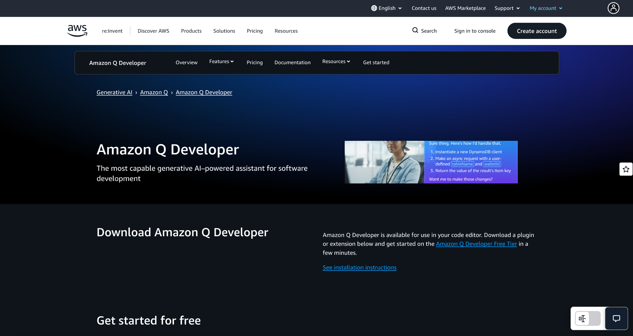 Amazon Q Developer targets developers building on AWS infrastructure with tight integration across AWS services, console and SDKs. The service provides code suggestions in IDEs, chat-based assistance for AWS questions and security scanning for vulnerabilities.
