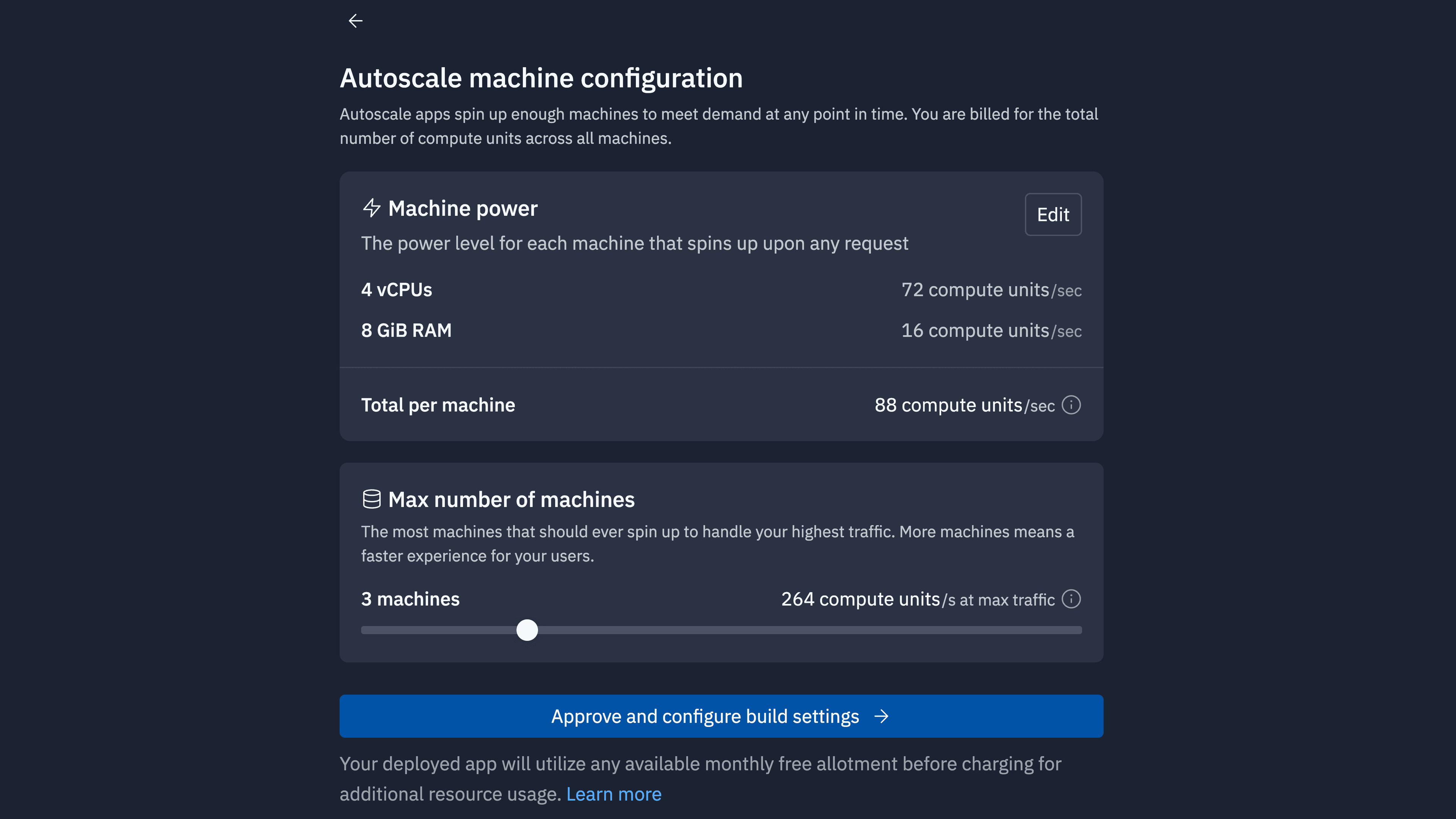 - You can use the default settings or customize the machine power and number by clicking "Edit" and adjusting the slider. Then click "Approve and configure build settings".