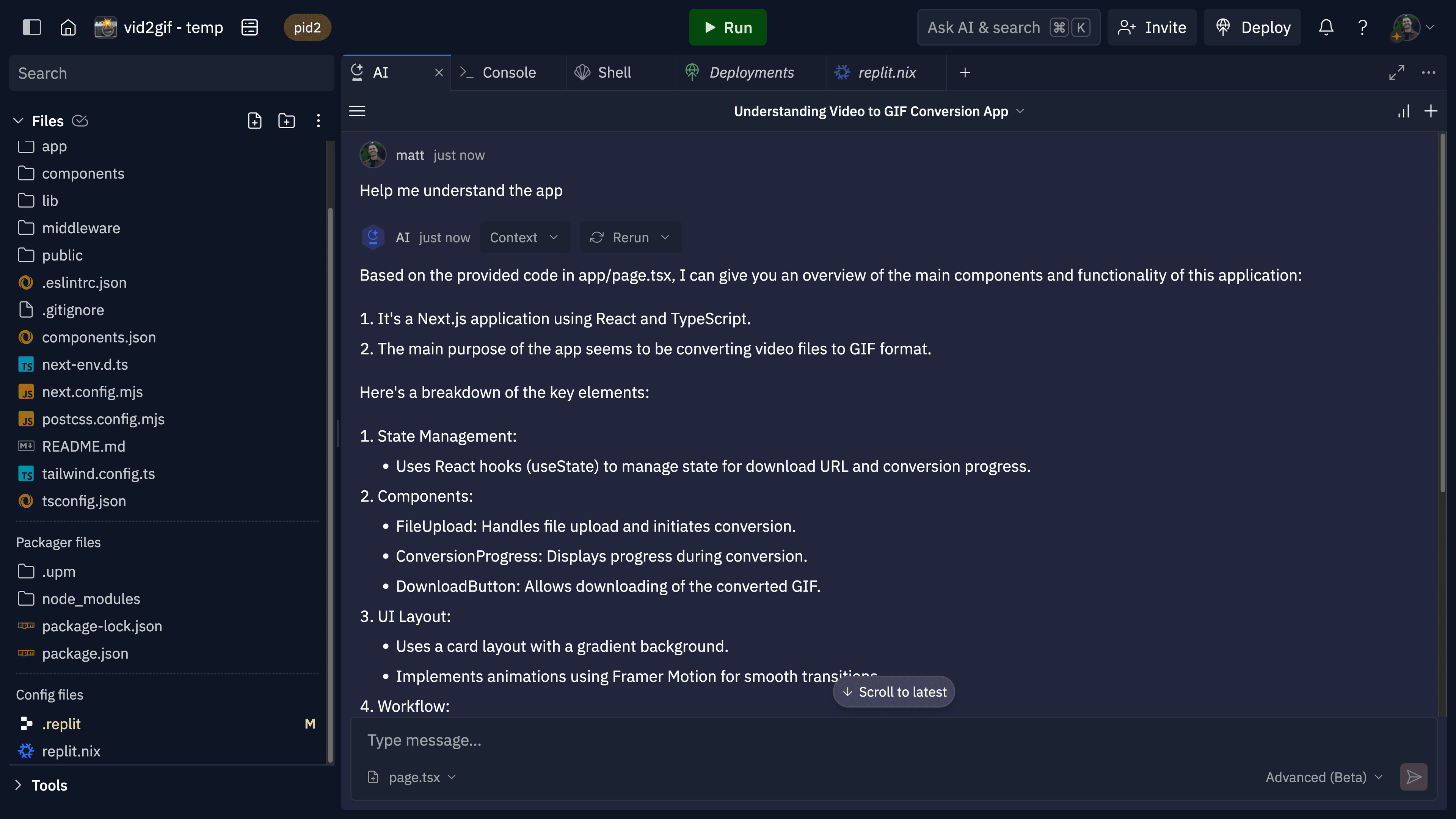 You've built and deployed a NextJS app that converts MP4s to GIFs using ffmpeg. We preconfigured ffmpeg in the Repl for you using the replit.nix file.