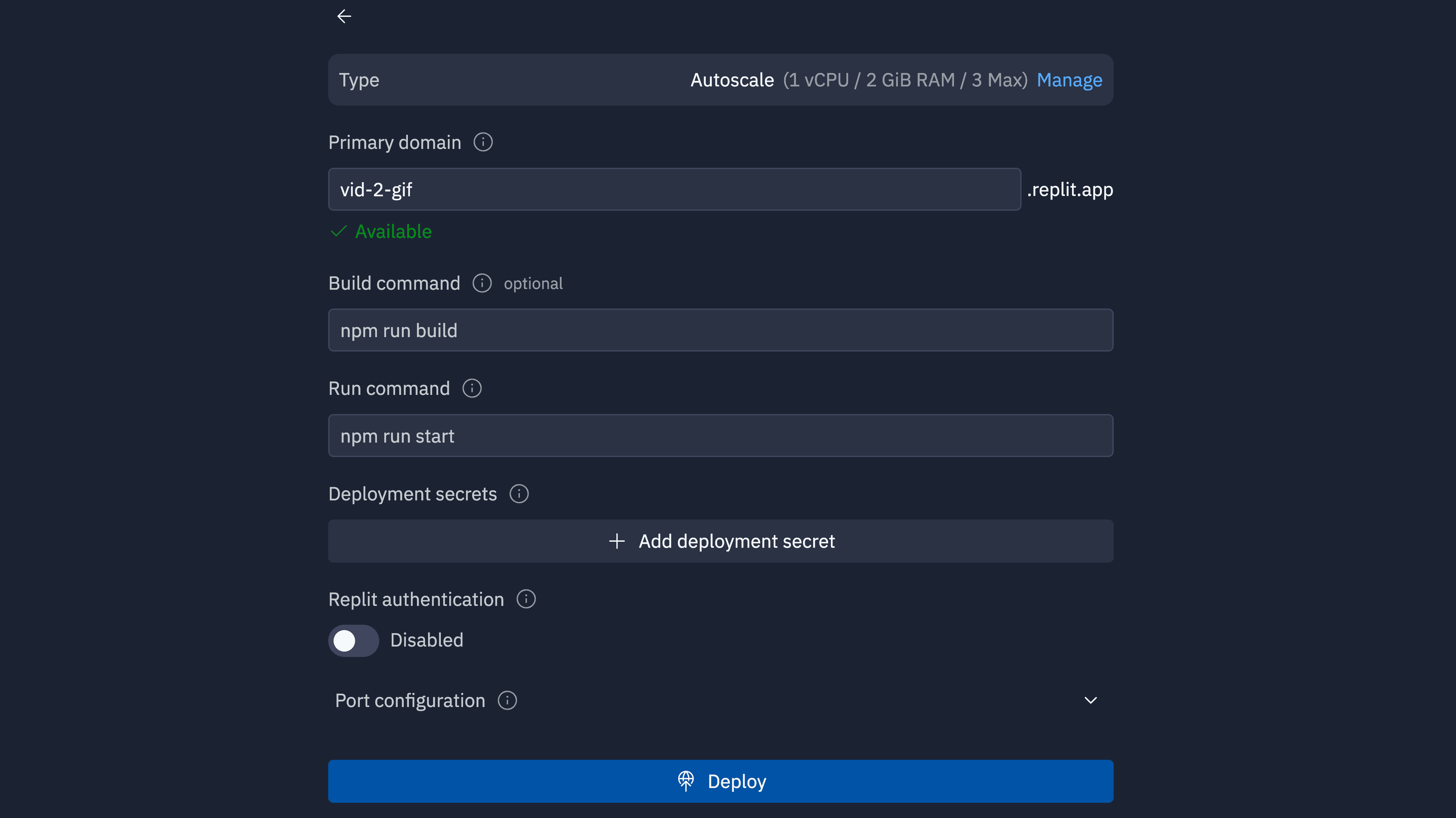 - For this app, we'll use an Autoscale deployment. Autoscale apps dynamically adjust to meet demand, optimizing costs while ensuring capacity for multiple users. Click "Autoscale".