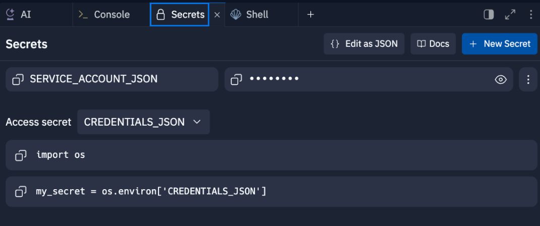 Once you have generated the service account key per the above instructions, open a secrets window within Replit and paste the service account key into the secrets value field titled SERVICE_ACCOUT_JSON