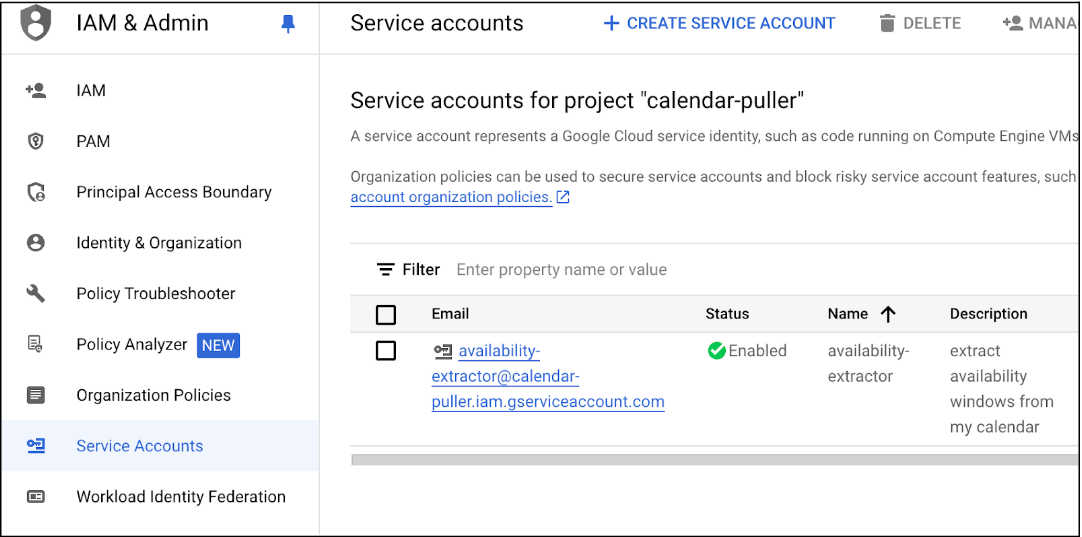 In order to connect your Google Calendar, you will need to follow these steps in Google's documentation. This process involves setting up a Google Cloud project, enabling the Google Calendar API, setting up a service account and adding the service account to your calendar.