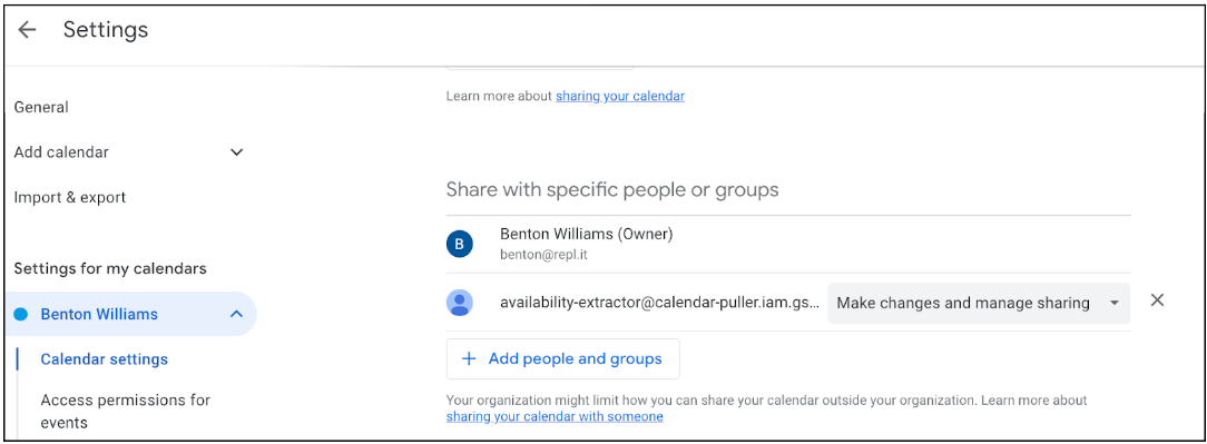 The last step is to add the service account email address to your calendar and give it read/write access